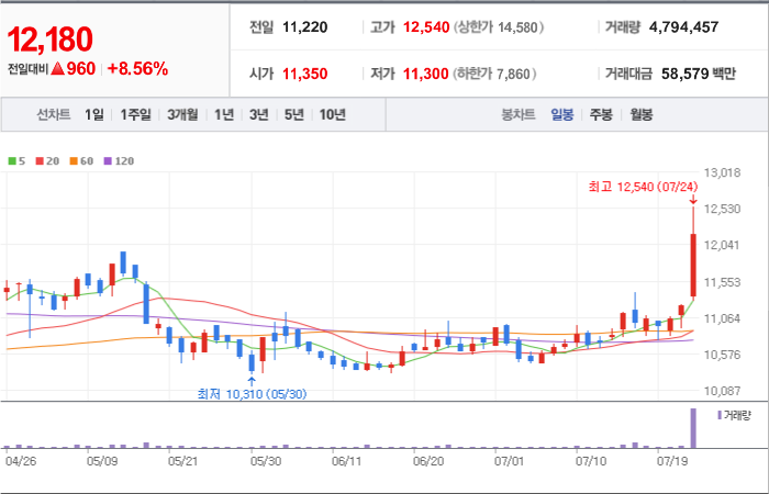현재가: 12,180, 어제대비:+상승