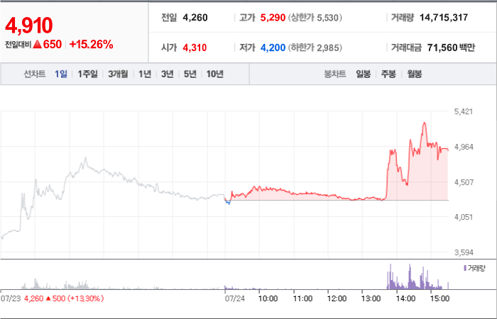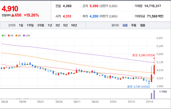 현재가: 4,910, 어제대비:+상승