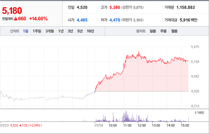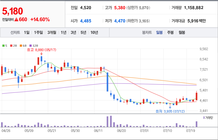 현재가: 5,180, 어제대비:+상승