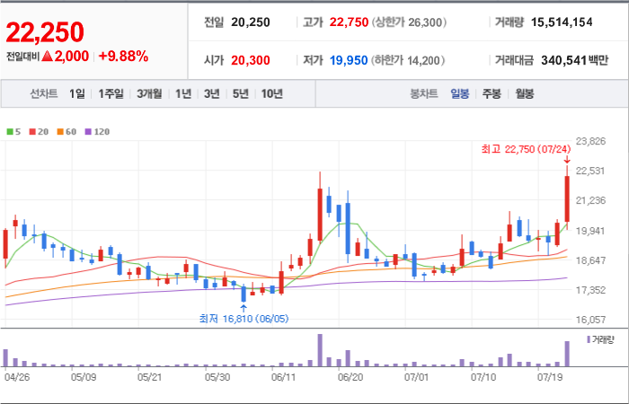 현재가: 22,250, 어제대비:+상승