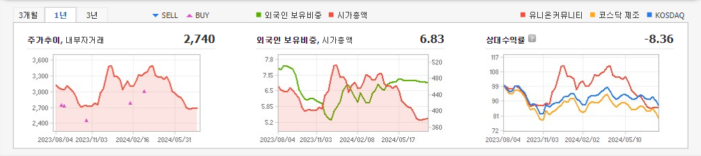 2024년 3월 전년동기 대비 별도기준 매출액은 2% 감소, 영업이익은 46.9% 증가, 당기순손실은 7.9% 증가. 상품 매출액은 전년동기 대비 소폭 상승하였지만 임가공 매출액이 존재하지 않고 제품 매출액이 소폭 감소하는 등 동사의 전체적인 매출액이 소폭 감소하였음. 매출액 감소에도 임차료, 광고선전비, 유지보수료와 같은 판매비와 관리비를 절약하는 노력 등으로 인해 영업이익은 증가.