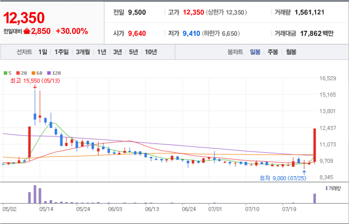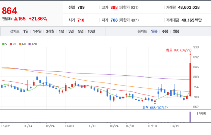 155시총: 1,023억원, 거래량:48,603,038, 거래대금:40,165백만