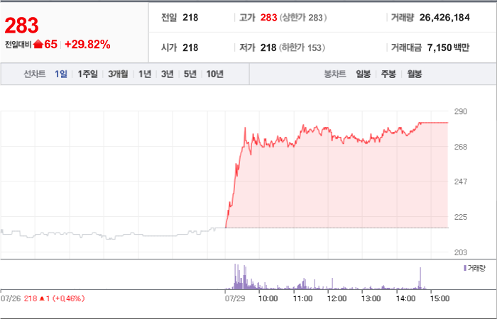 65시총: 203억원, 거래량:26,426,184, 거래대금:7,150백만