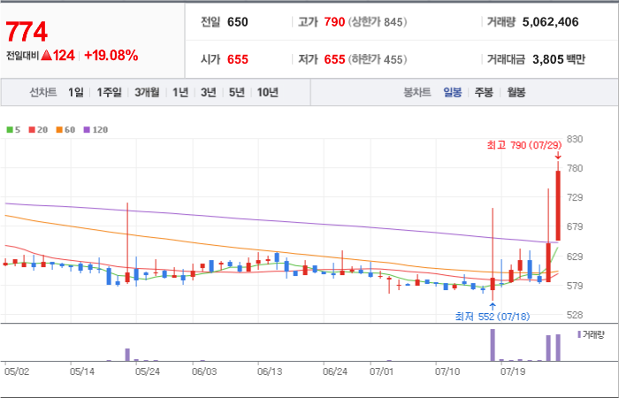 124시총: 315억원, 거래량:5,062,406, 거래대금:3,805백만