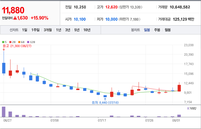 1,240시총: 739억원, 거래량:5,330,866, 거래대금:26,856백만