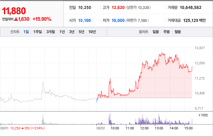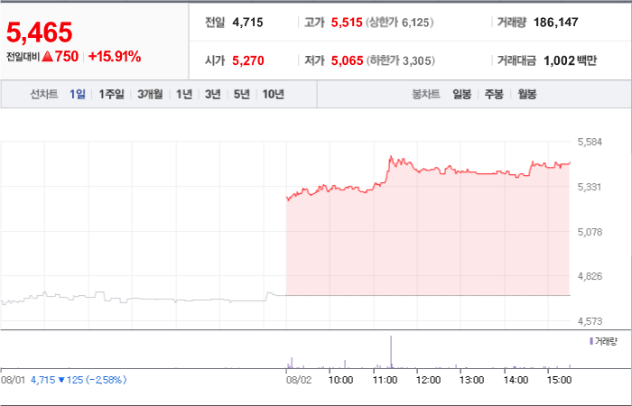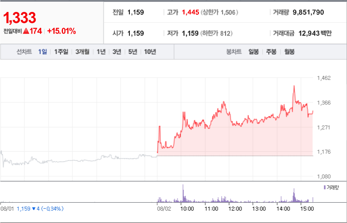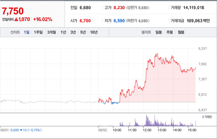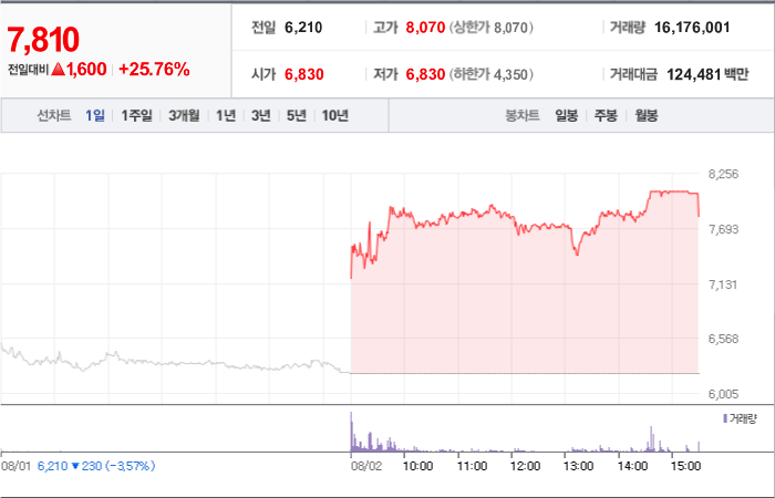1,600시총: 1,306억원, 거래량:16,176,001, 거래대금:124,481백만