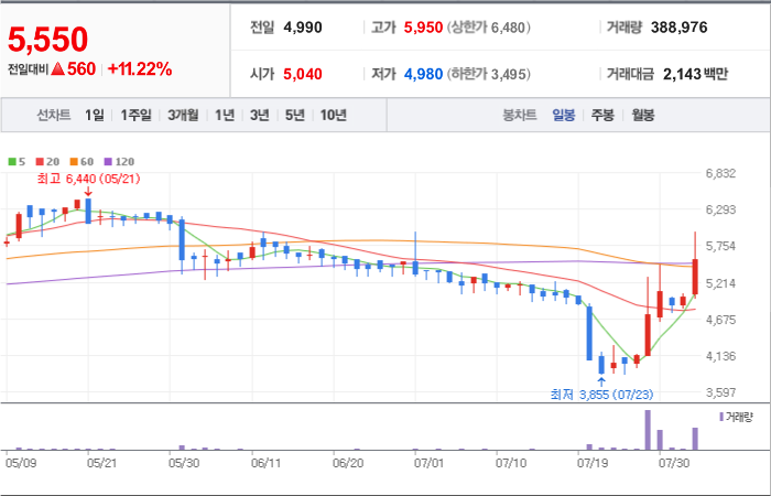 560시총: 439억원, 거래량:388,976, 거래대금:2,143백만