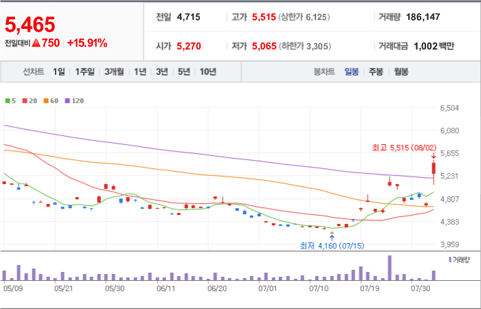 750시총: 164억원, 거래량:186,147, 거래대금:1,002백만