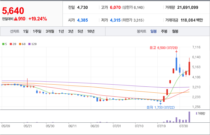 910시총: 767억원, 거래량:21,691,099, 거래대금:118,084백만