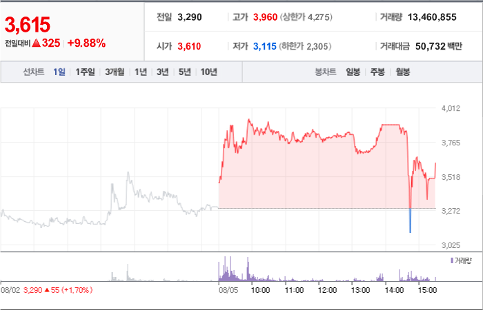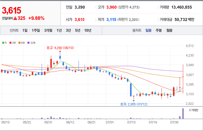 현재가: 3,615, 어제대비:+상승