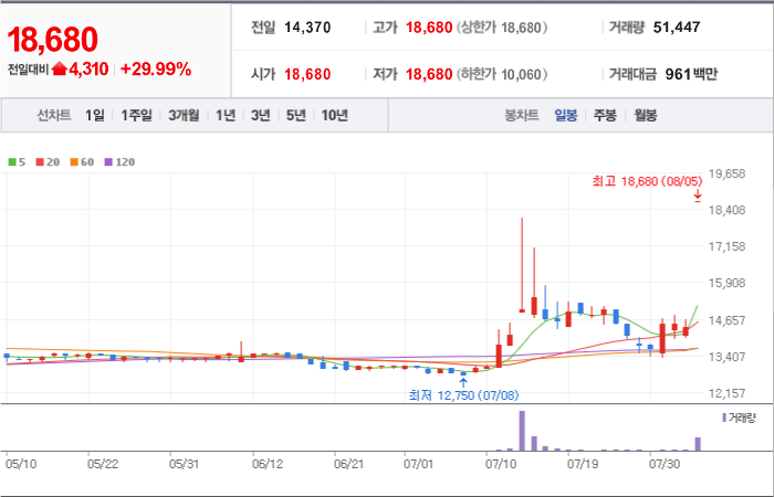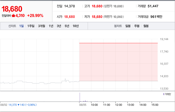 현재가: 18,680, 어제대비:+상한가