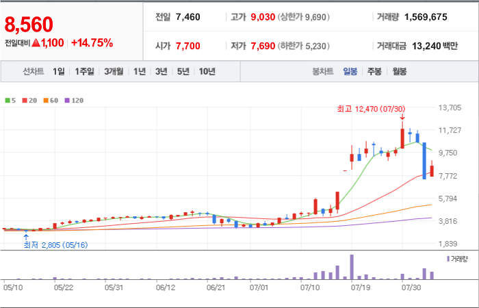 1,590시총: 1,647억원, 거래량:10,251,473, 거래대금:146,345백만