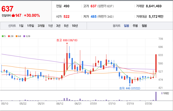 현재가: 637, 어제대비:+상한가