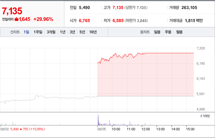 현재가: 7,135, 어제대비:+상한가