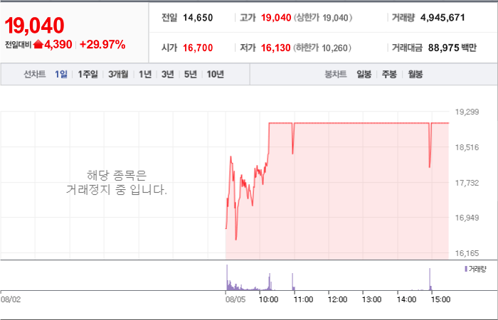 현재가: 19,040, 어제대비:+상한가