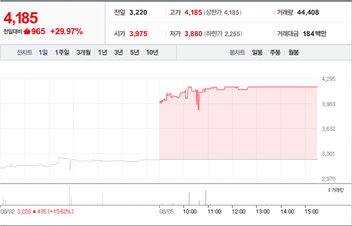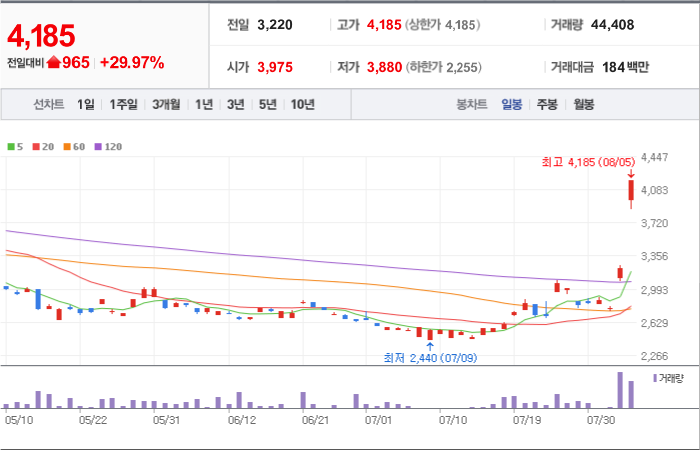 현재가: 4,185, 어제대비:+상한가