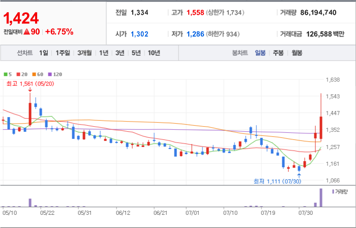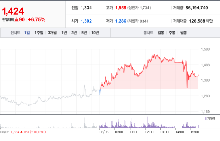 현재가: 1,424, 어제대비:+상승