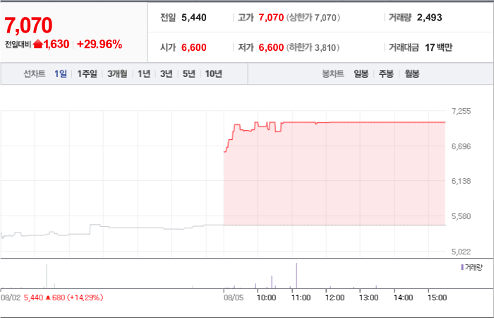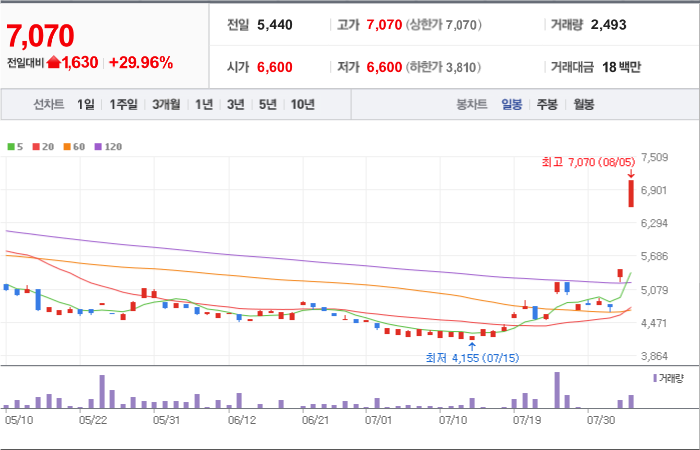 현재가: 7,070, 어제대비:+상한가