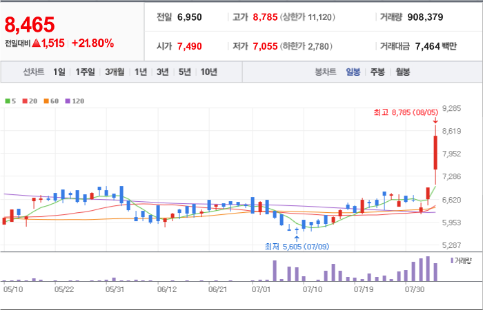 현재가: 8,465, 어제대비:+상승