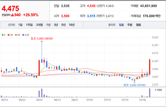 4,390시총: 3,149억원, 거래량:4,945,671, 거래대금:88,975백만
