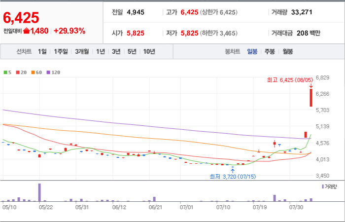 현재가: 6,425, 어제대비:+상한가