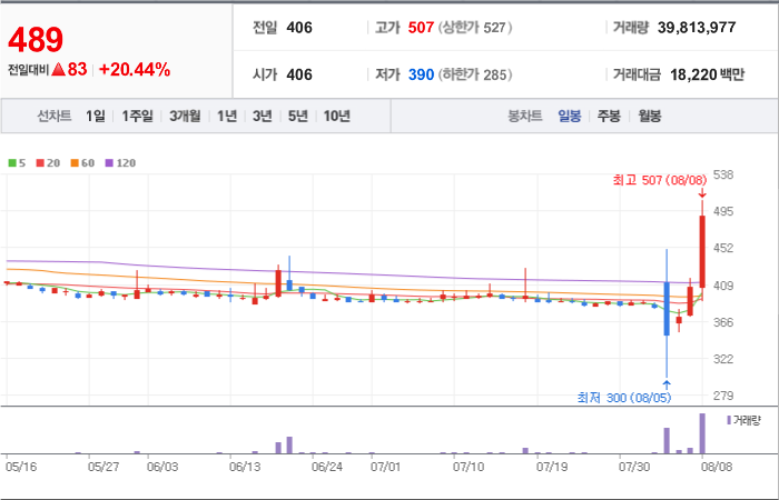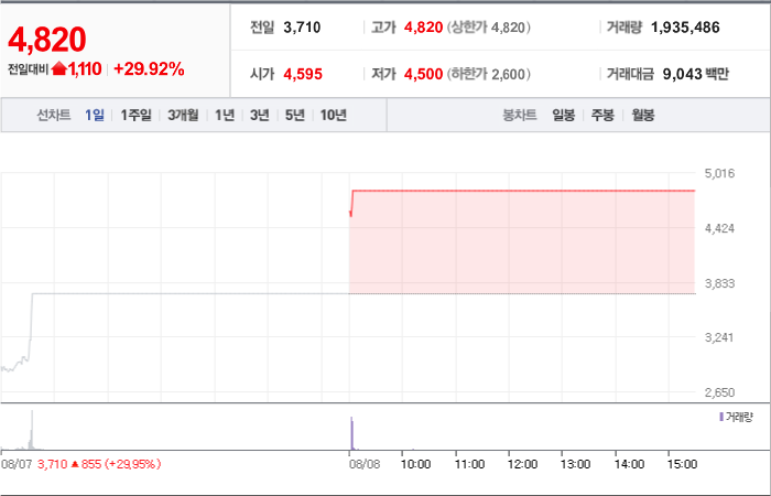 현재가: 4,820, 어제대비:+상한가