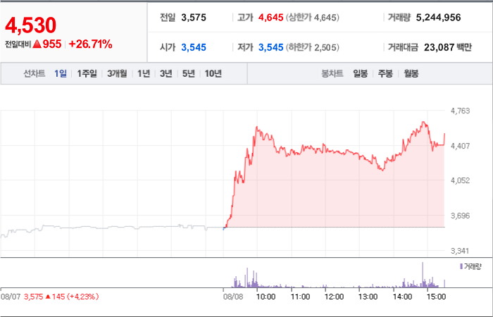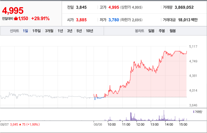 현재가: 4,995, 어제대비:+상한가