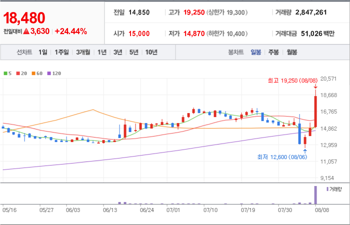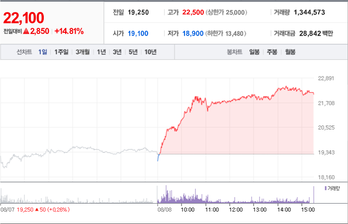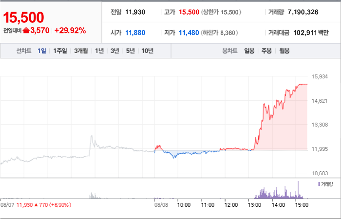 현재가: 15,500, 어제대비:+상한가