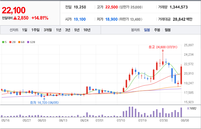 현재가: 22,100, 어제대비:+상승