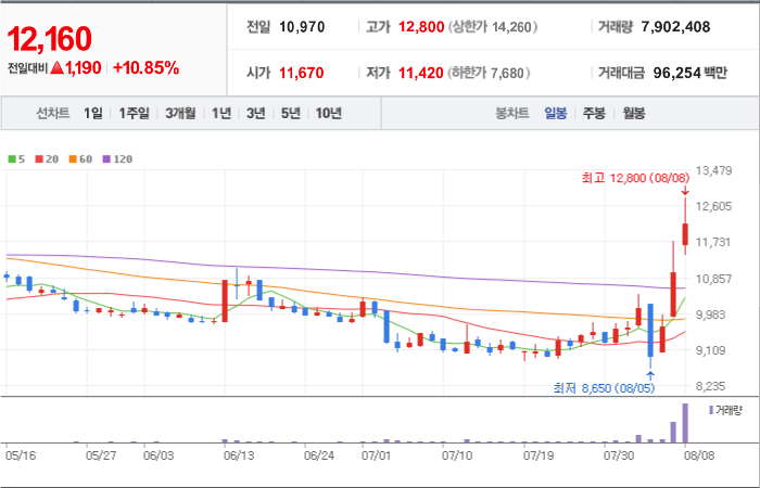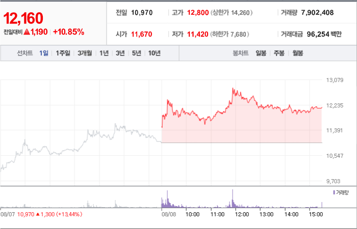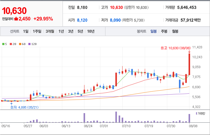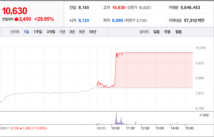 현재가: 10,630, 어제대비:+상한가