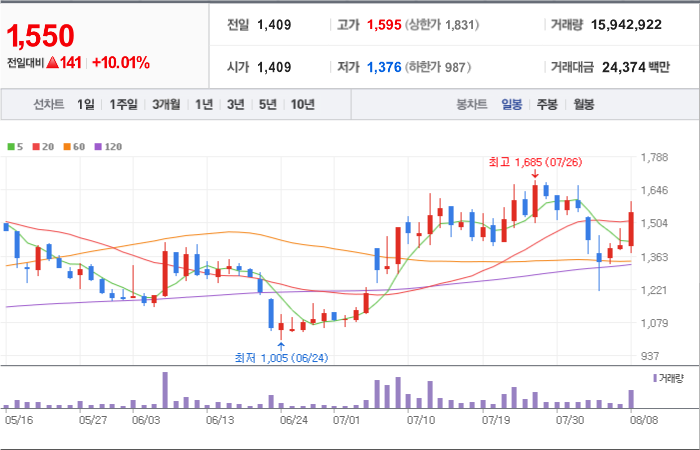 1,190시총: 1조 5,136억원, 거래량:7,900,190, 거래대금:96,227백만
