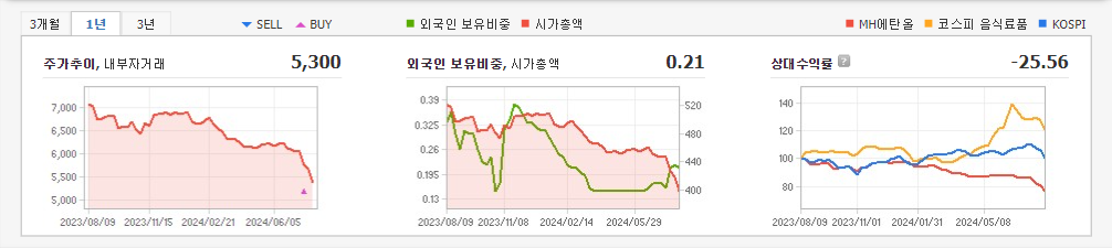 2024년 3월 전년동기 대비 연결기준 매출액은 6.9% 감소, 영업이익은 11.9% 감소, 당기순이익 흑자전환. 2023년에는 경기침체 등으로 인해 주류판매가 감소하여 주정 판매량이 2.21% 감소 하였으며 금년에도 주정 소비량도 경기침체 및 저도주 소비가 늘어나며서 전년도 보다 감소할 것으로 예상됨. 주정은 타피오카와 쌀보리 등 곡물로 만드는데, 최근 비용 부담이 커지면서 인상이 불가피 하게 되었음.