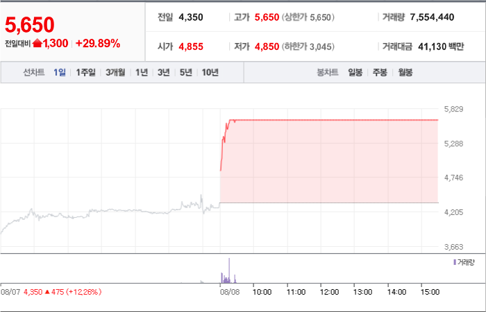 현재가: 5,650, 어제대비:+상한가