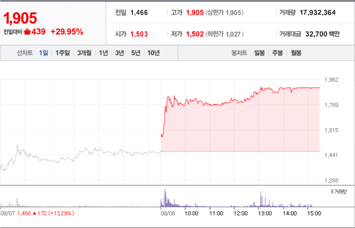 현재가: 1,905, 어제대비:+상한가