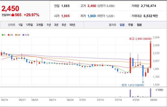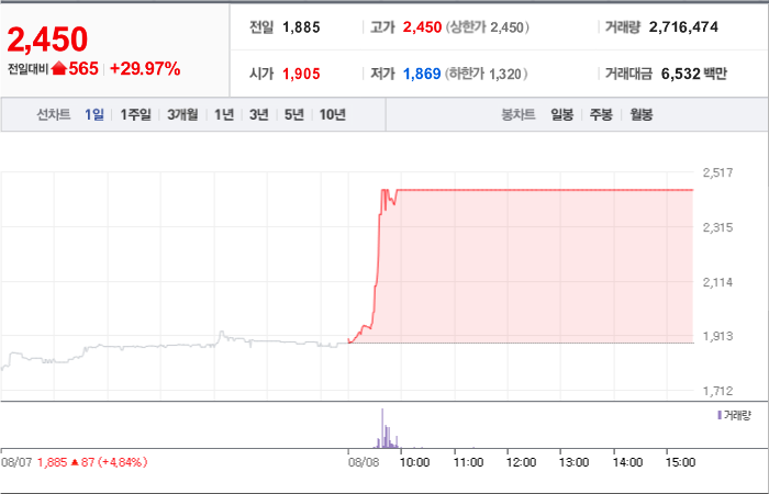 현재가: 2,450, 어제대비:+상한가