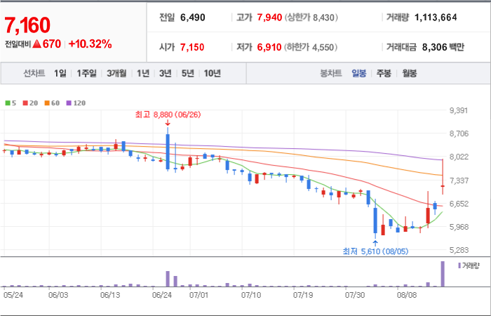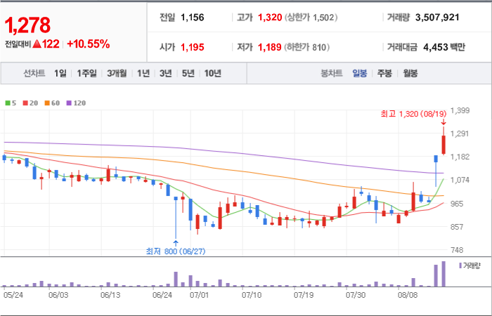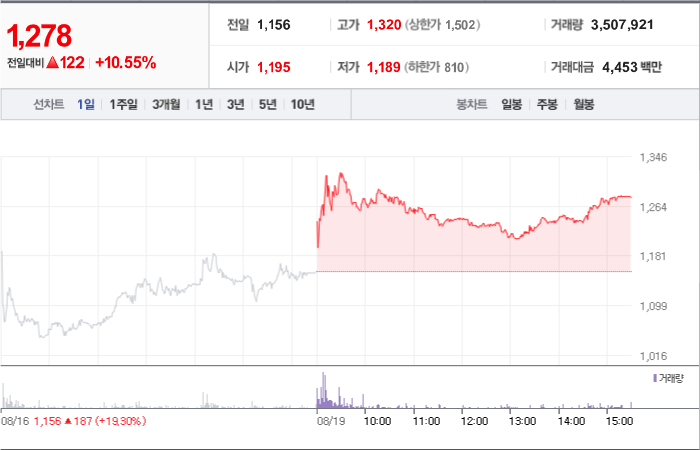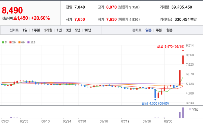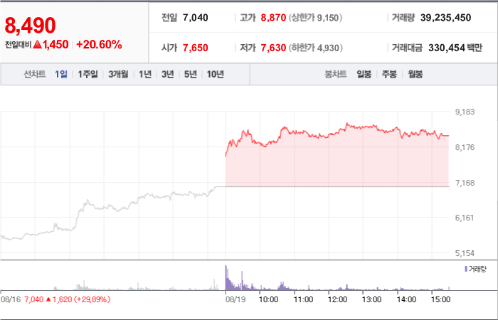 1,450시총: 5,095억원, 거래량:39,235,450, 거래대금:330,454백만