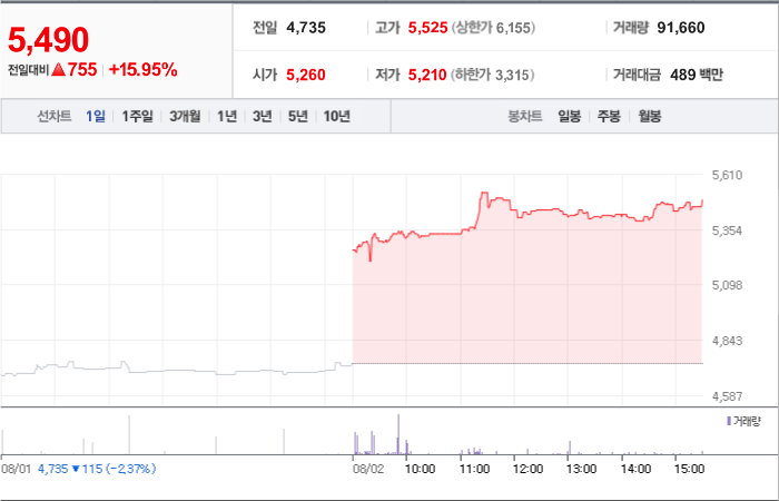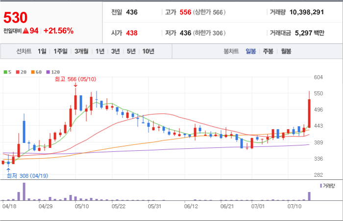 현재가: 5,560, 어제대비:+상한가