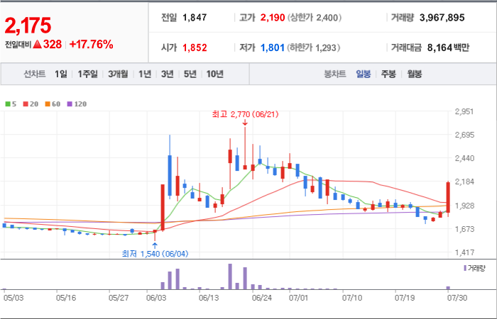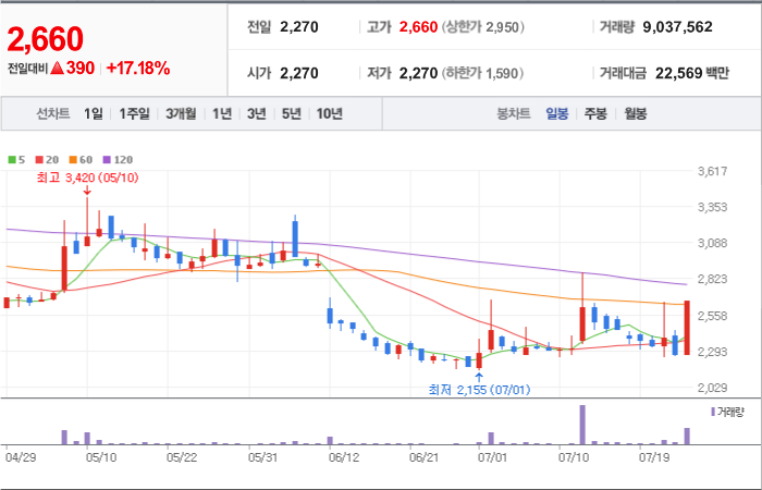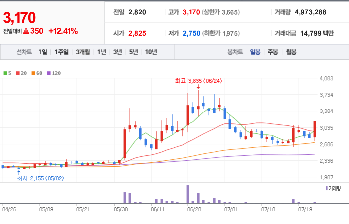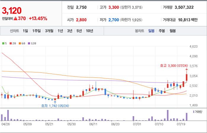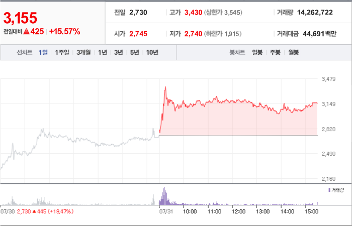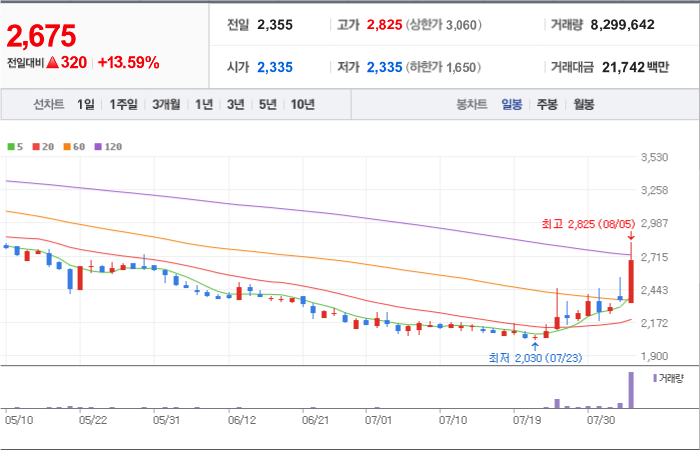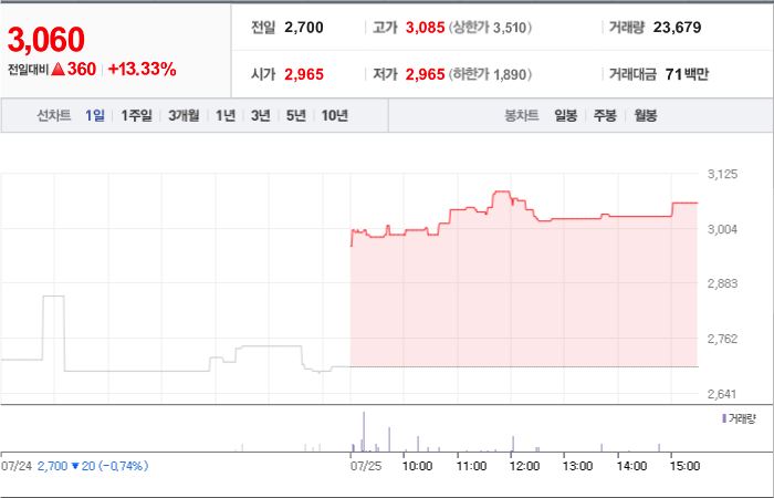 현재가: 3,275, 어제대비:+상한가