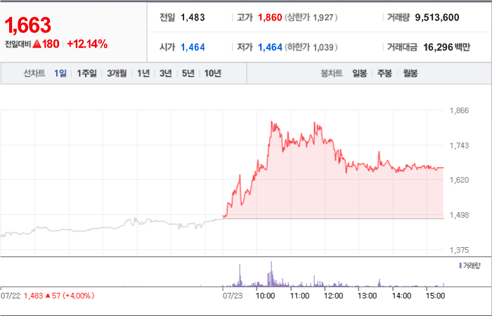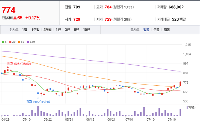 935시총: 573억원, 거래량:14,748,775, 거래대금:55,571백만