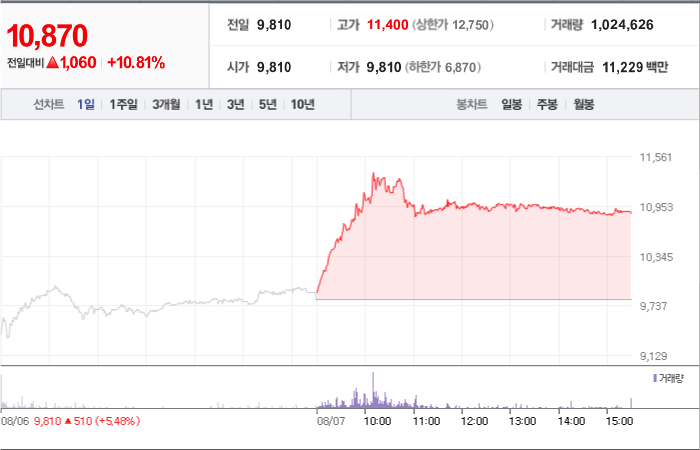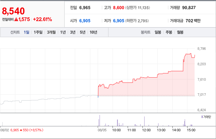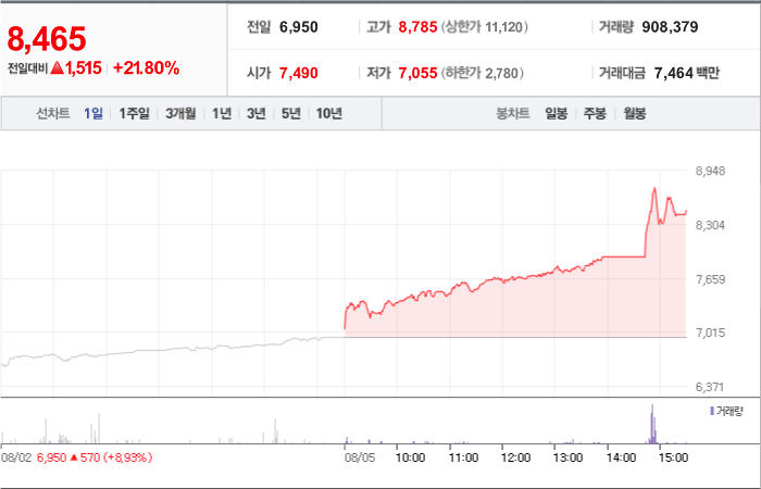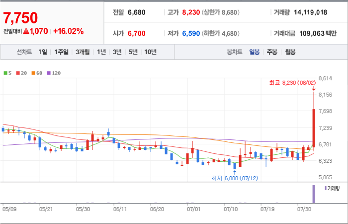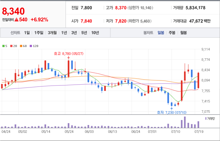 현재가: 8,750, 어제대비:+상승