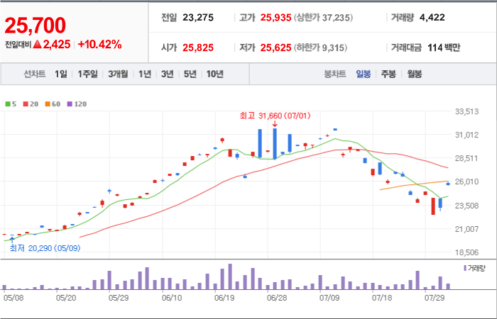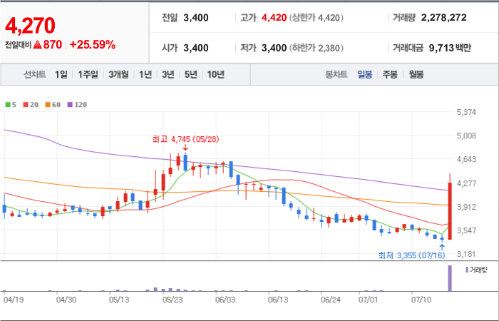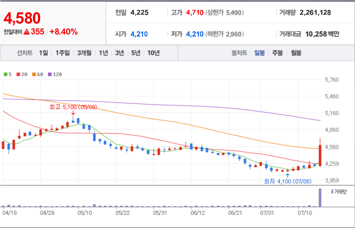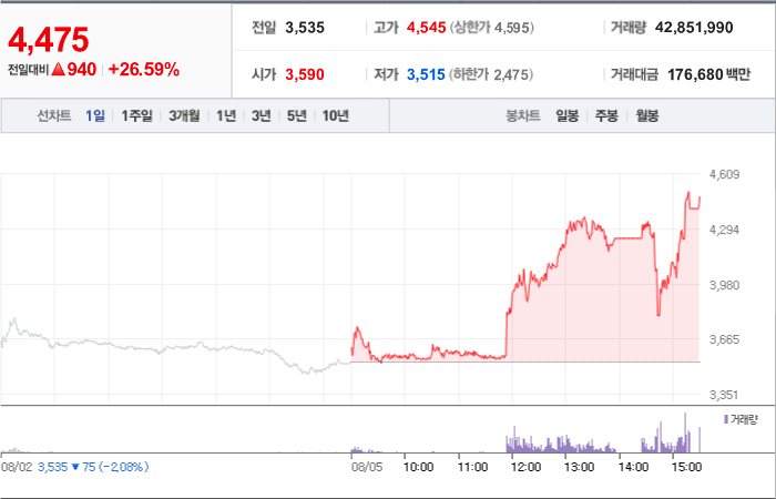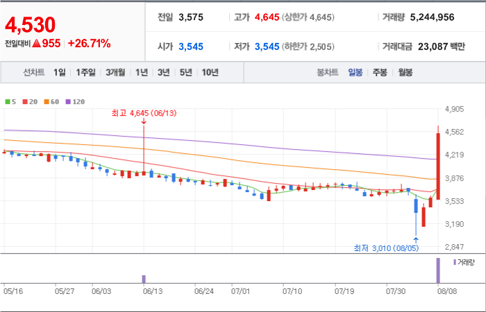 4,250시총: 1조 1,056억원, 거래량:4,576,455, 거래대금:173,009백만