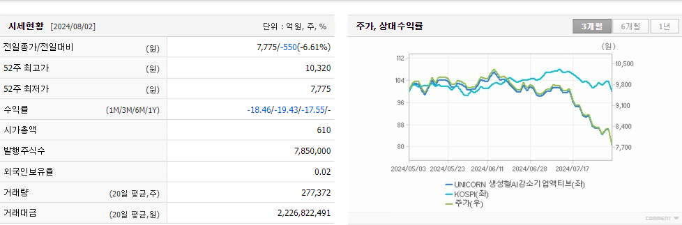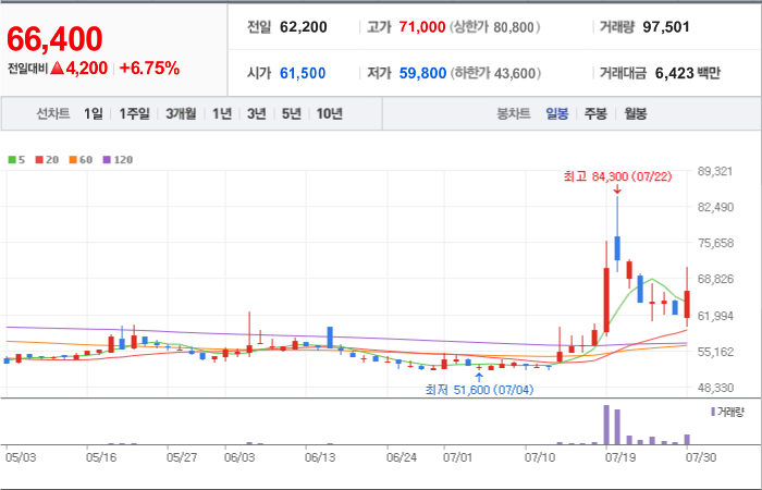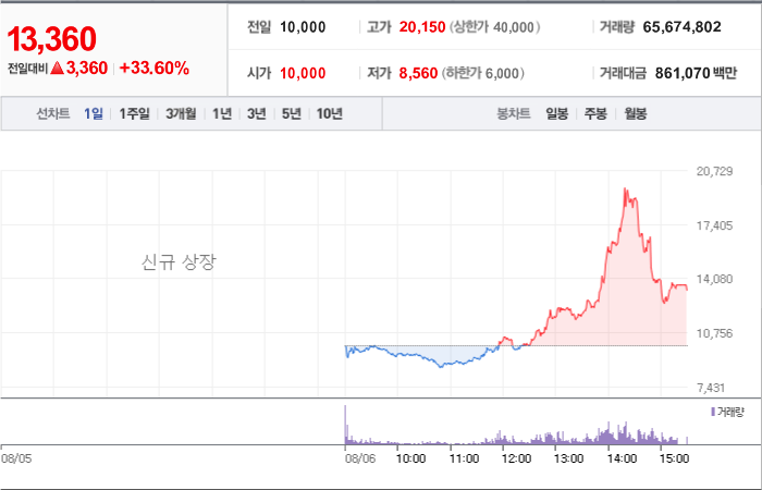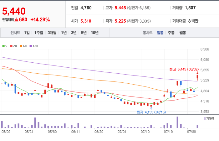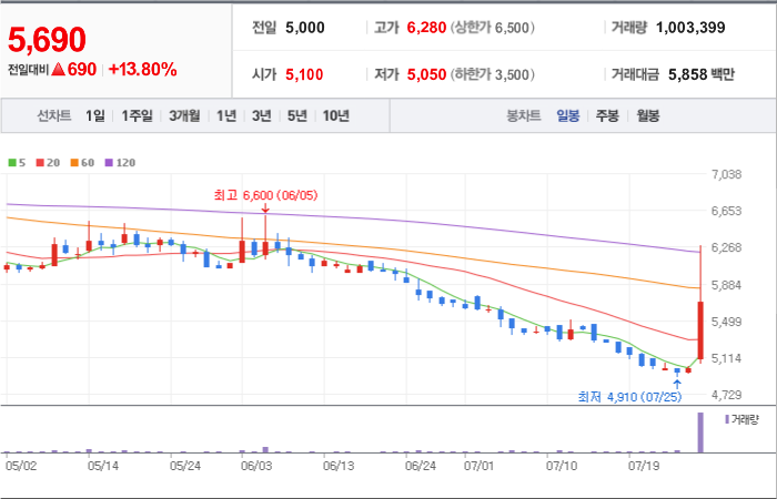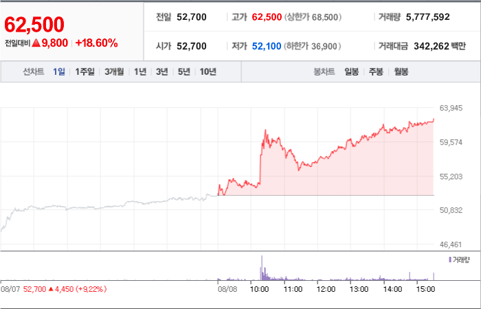 3,600시총: 5조 7,627억원, 거래량:8,071,659, 거래대금:423,494백만