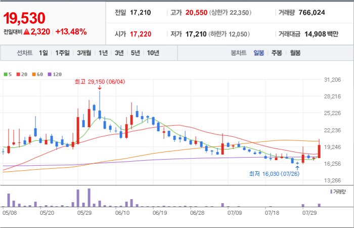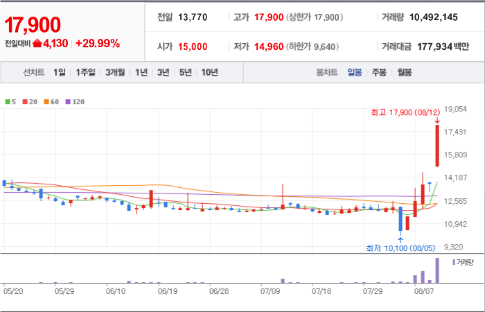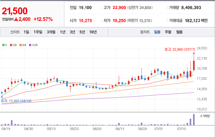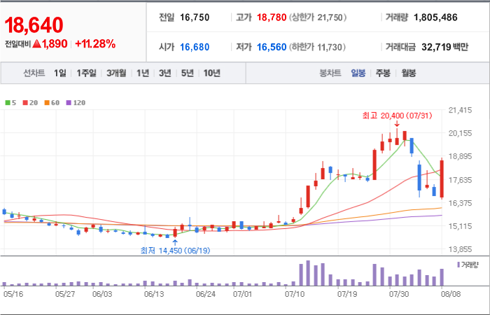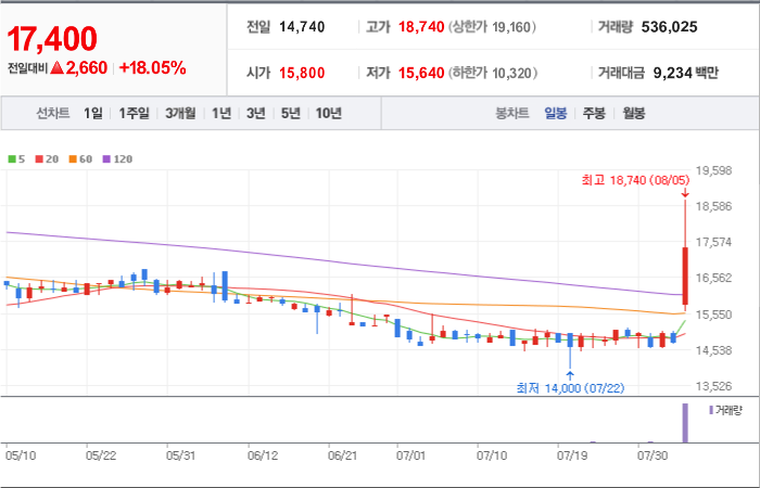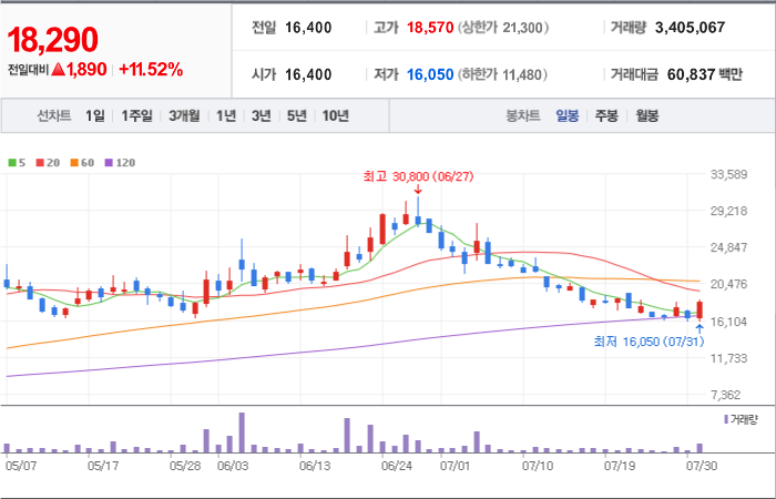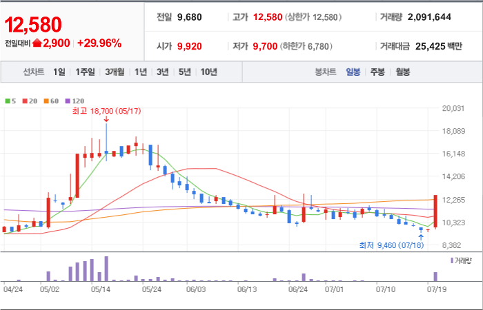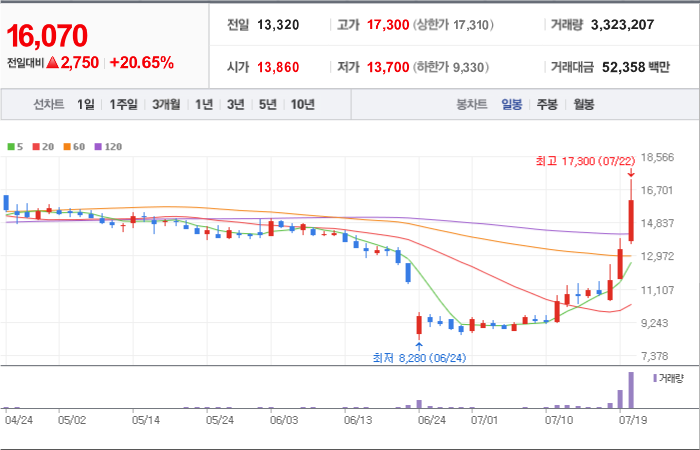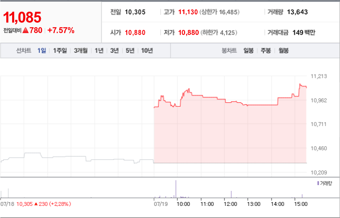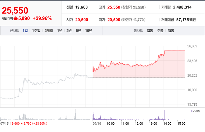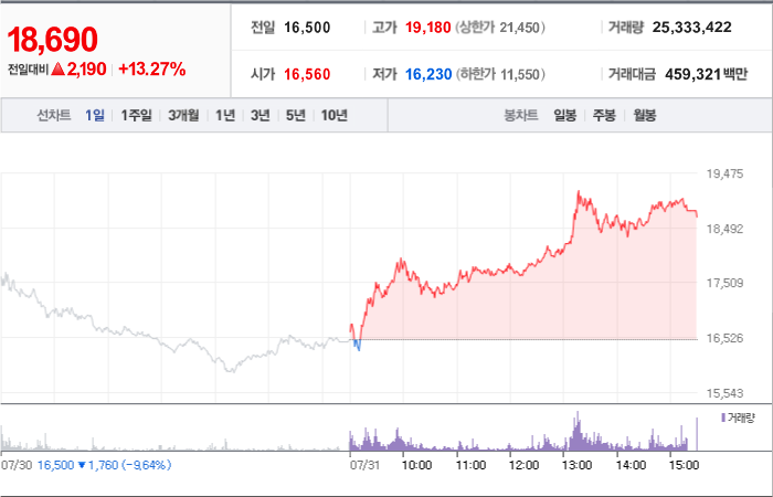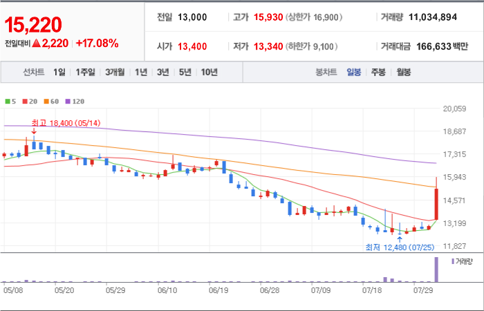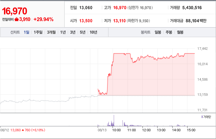 현재가: 16,970, 어제대비:+상한가
