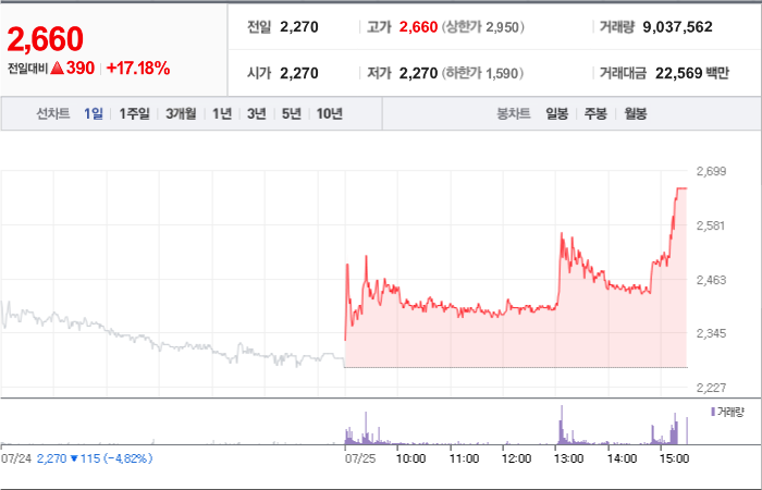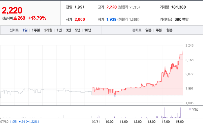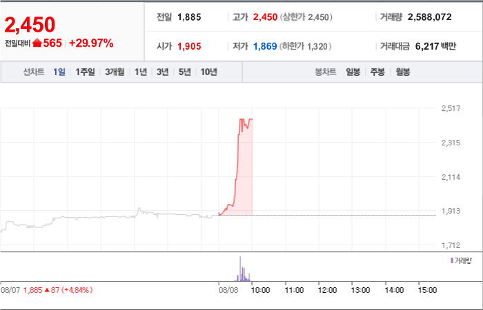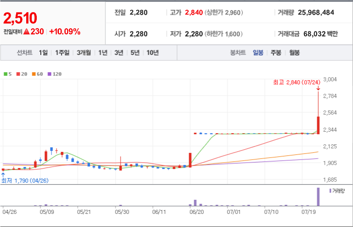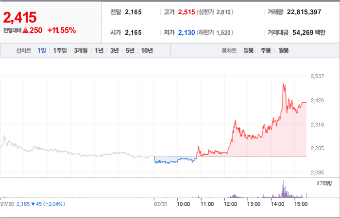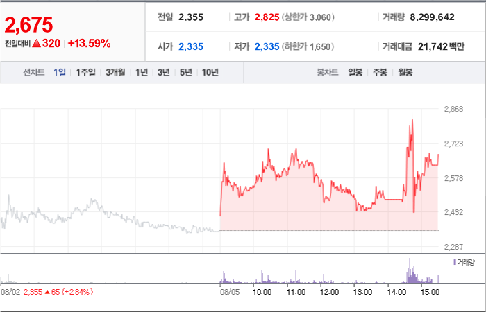 2,930시총: 2,444억원, 거래량:7,692,634, 거래대금:121,157백만