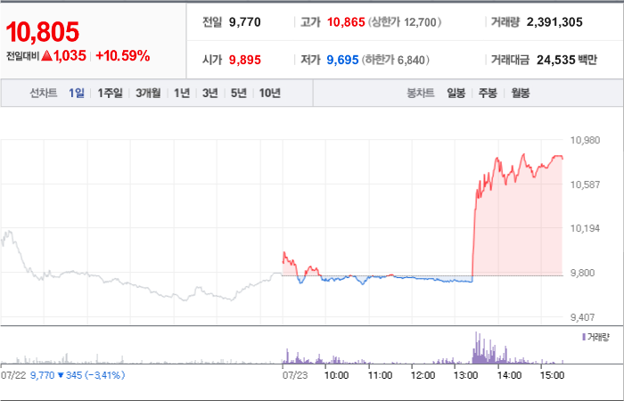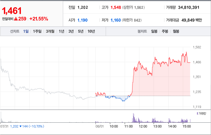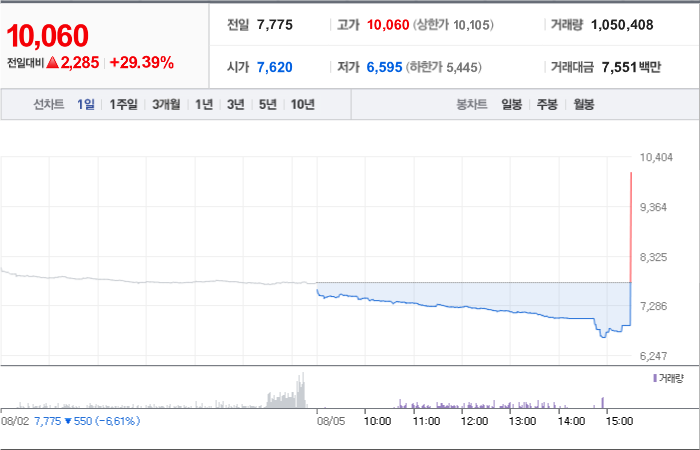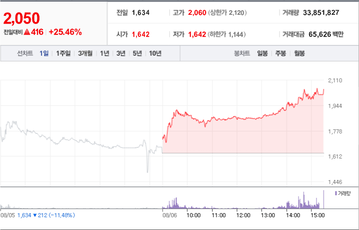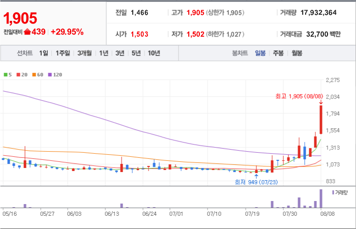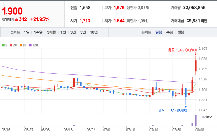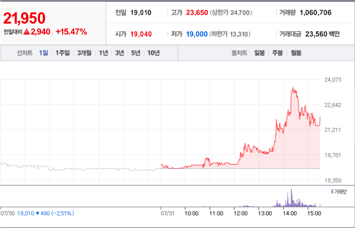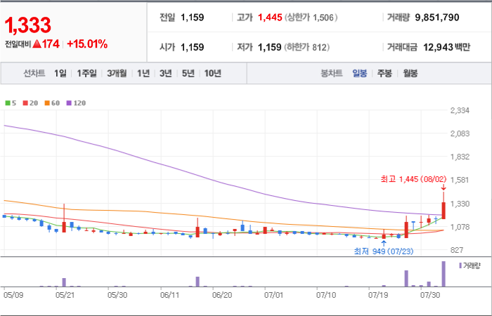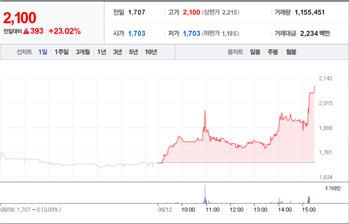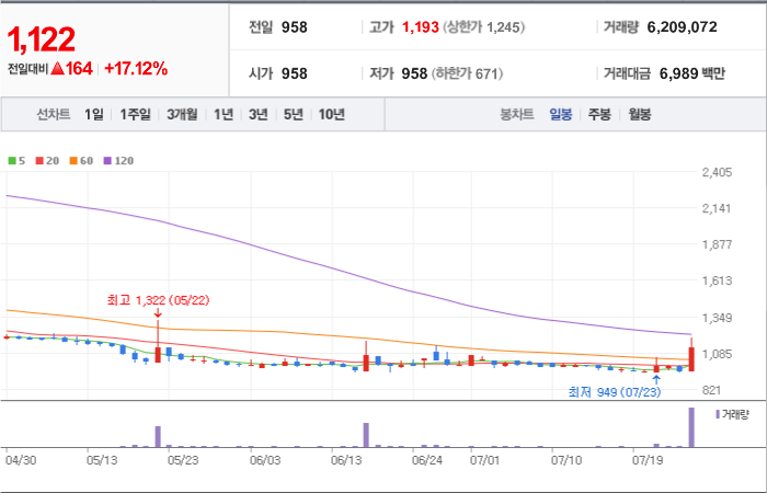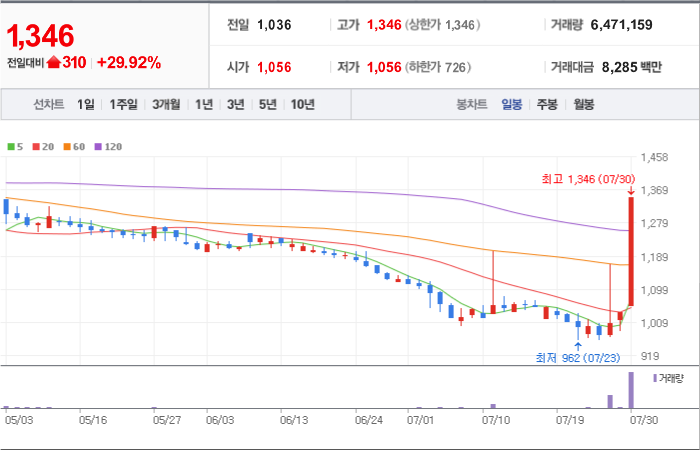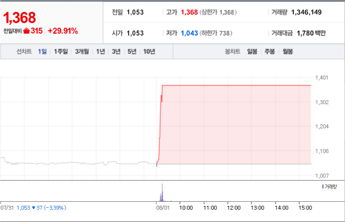 현재가: 1,047, 어제대비:+상한가