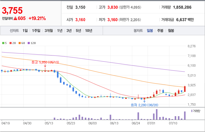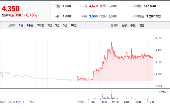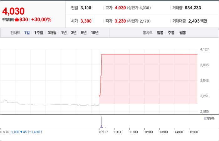 현재가: 4,045, 어제대비:+상한가