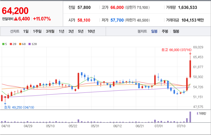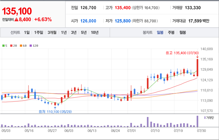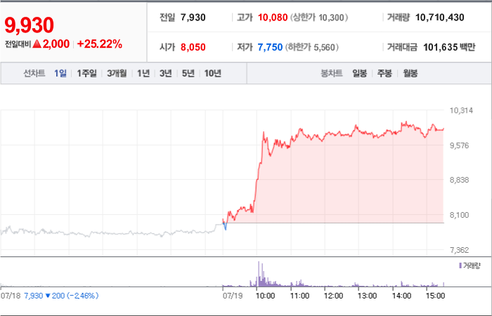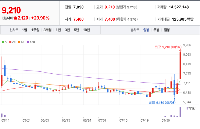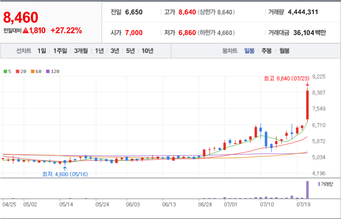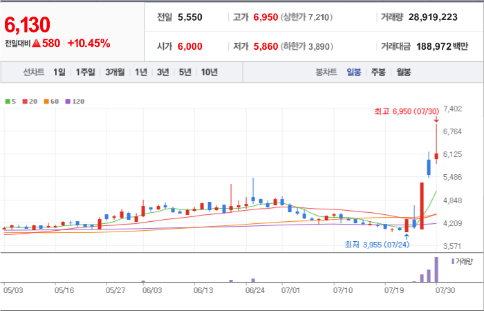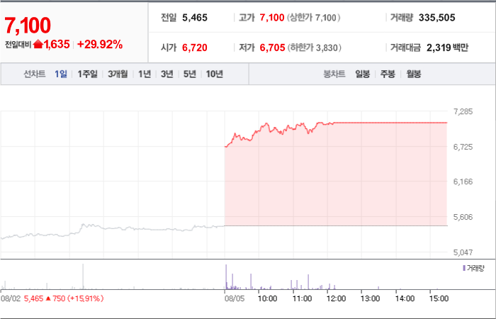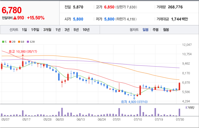 현재가: 6,760, 어제대비:+상한가