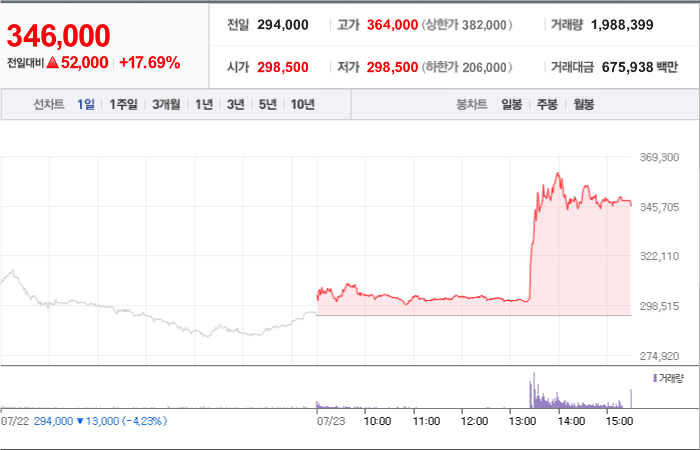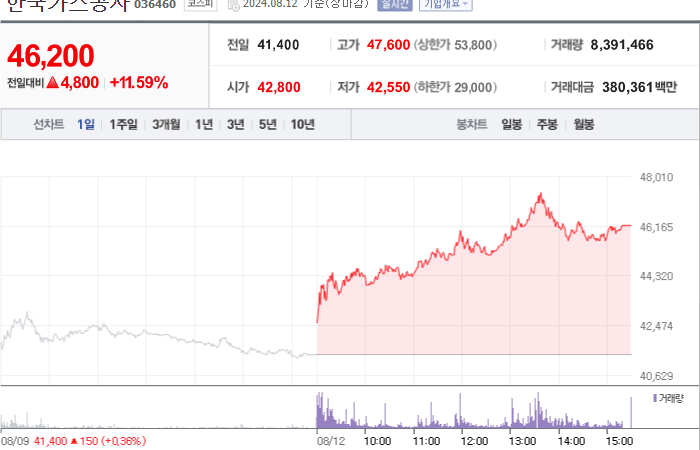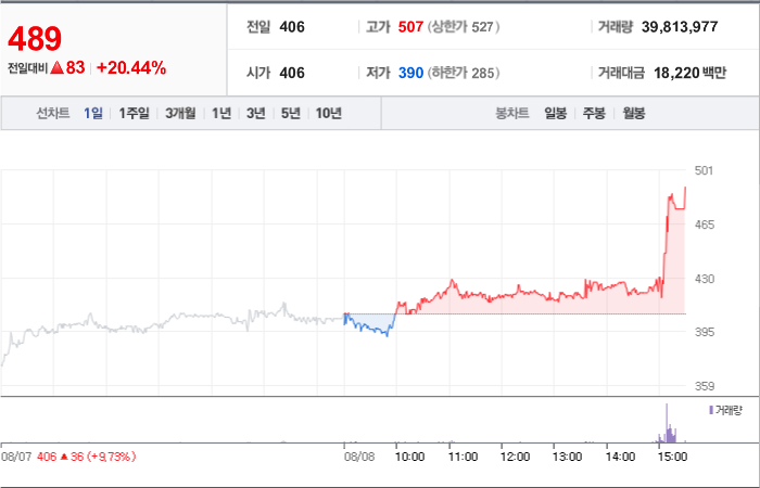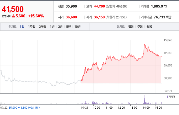 38,000시총: 15조 8,517억원, 거래량:1,276,545, 거래대금:407,930백만
