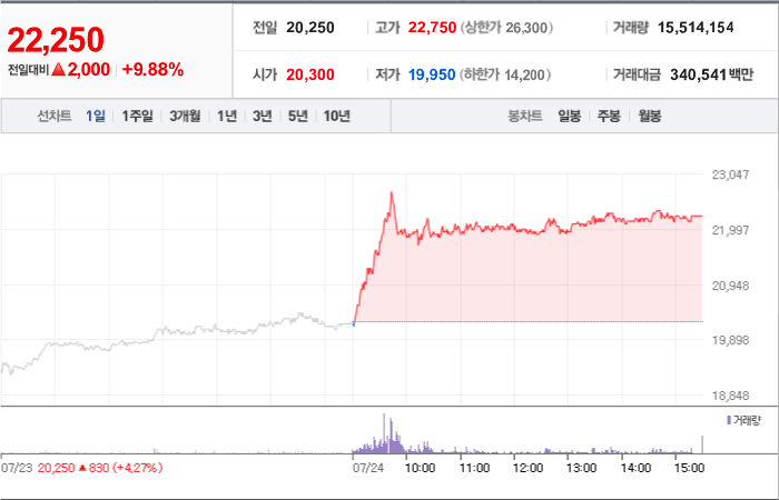 1. 한농화성 등락률: +23.07%