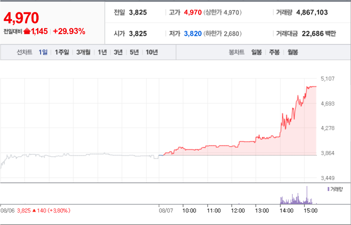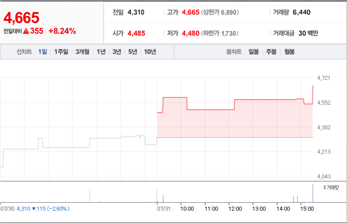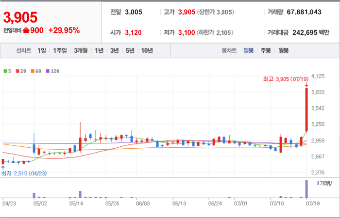 현재가: 4,065, 어제대비:+상한가